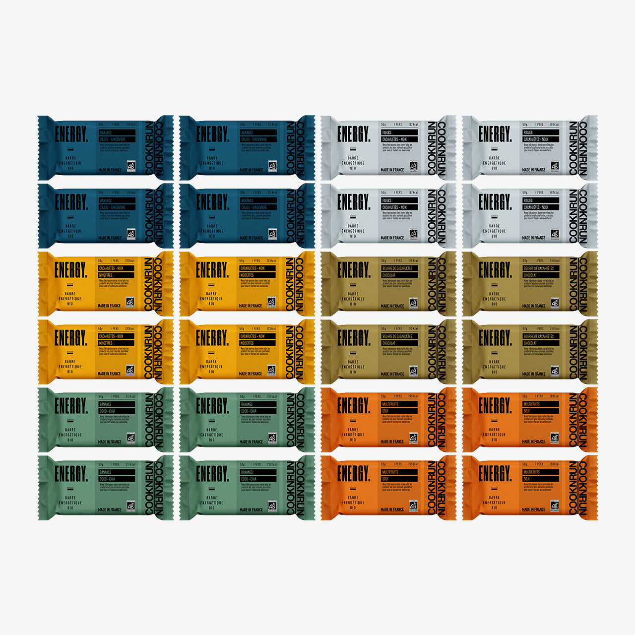 - Pâte de figues*(80%), Poudre d’amandes*, Cacahuètes*(6,4%), Noix*(6,4%), Huile d’amande*, Fleur de sel de Guérande*(0,3%).